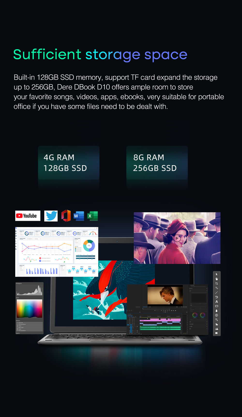 The DDR4 memory can greatly improve the data transfer speed, making the D10 process tasks faster. The read and write speed of the solid state drive is more than ten times that of the ordinary hard drive, allowing you to open web documents faster.