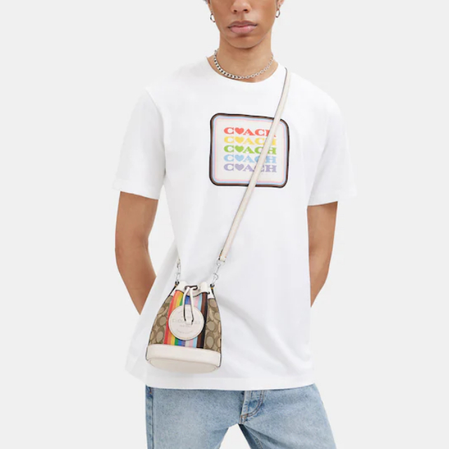 PRE-ORDER COACH Mini Dempsey Bucket Bag In Signature Jacquard With Rainbow Stripe And Coach Patch CJ661