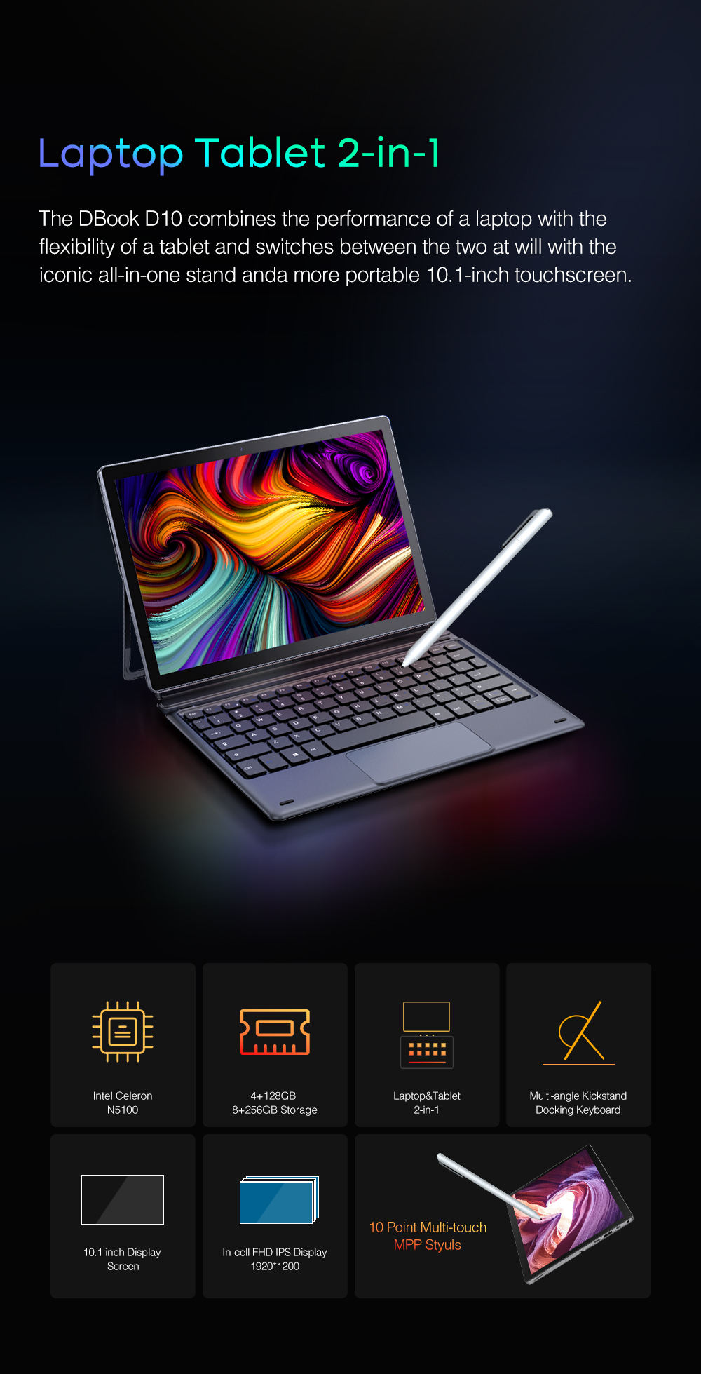 D10 Tablet Laptop 10.1 Inch 2 in 1 Intel Celeron N5100 8GB RAM 256GB SSD Portable FHD IPS Touch Scre